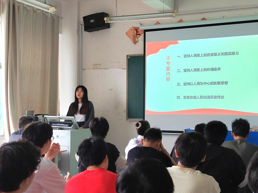 课上,授课老师围绕“坚持人民至上”专题,从坚持人民至上的历史意义和现实意义、坚持人民至上的价值追求、坚持以人民为中心的发展思想等方面展开讲解。课堂内容丰富、互动频繁。